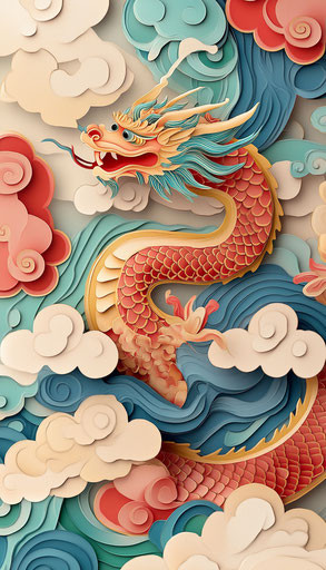 Transform your imagination with this whimsical illustration of a playful Chinese dragon soaring among the clouds in a starry night sky. The intricate paper-cut design and gentle pastel colors invite you into a dreamy and enchanting atmosphere, inspiring wonder and a sense of adventure.