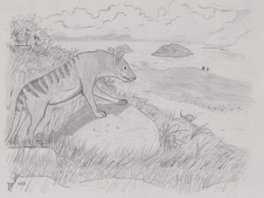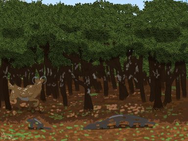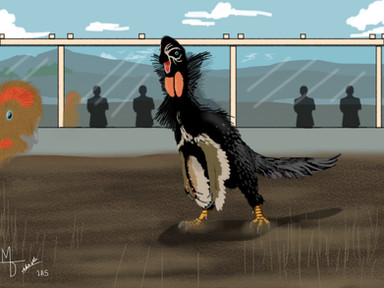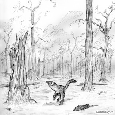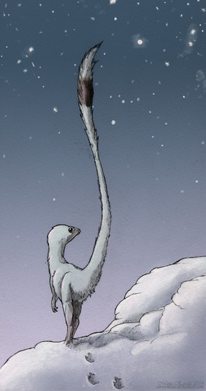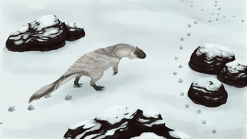 An adult male Troodon walks on the surface of a heavy Cretaceous snow.(Ps: Traynak is supposed to look like this as an adult, he just hasn't started to develop the full mane. Although, if you look closely, you can see the tiny black feathers developing)