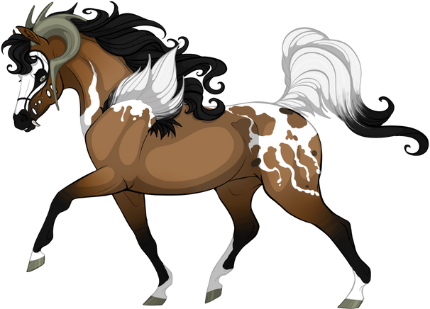 Genotype: ee aa nO nSb nSpl CalCal nClt nHs nJe Mm nOk nRi - Chestnut Overo Sabino Splash Calva Clownfish Hornstripe Jester Merle Okapi Dun Rictus