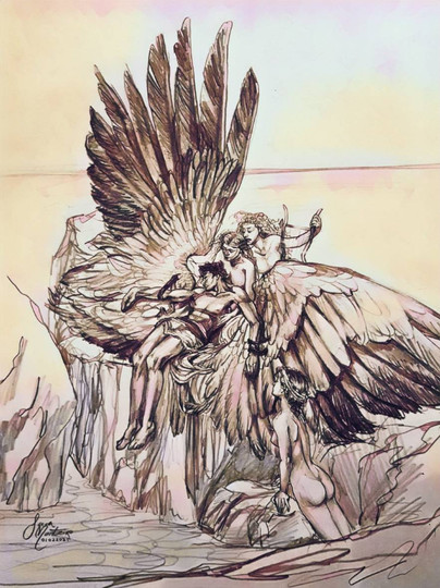 Stunning. The detail in the birds bodies is awesome, they're almost coming out from the piece. Prometeo suffering is evident, and crude. Nice job!