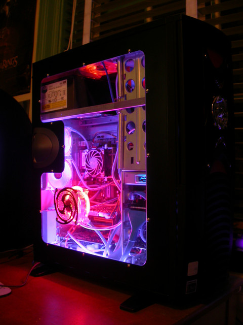 Cooling: 2 x 80mm(front), 2 x 80mm thermal controlled clear fans (rear), 1 x 80mm(top), 1 x 80mm tri-color LED fan (side window), 1x Aluminum CPU heatsink and fan, 1 x 120mm blue LED fan (PSU)