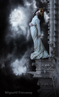 Tremendous idea! Just a thought, the light on the woman and the building looks out of place. It doesn't fit in really with the sky and the moon, lightwise. I think perhaps if you could darken the wall and perhaps add a bit of coloured light to the woman to relate with the vague greenish colour of the sky, that would help.