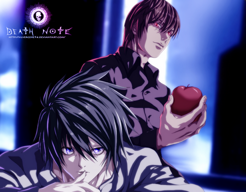 This picture is very pleasing to the eye, with the way L and Light are set up. Even at first it's astonishing, but it becomes phenomenal when you look at the background, which contains the pages of the Death Note on one side and chains on the other. Very well done, I could look at it for hours.