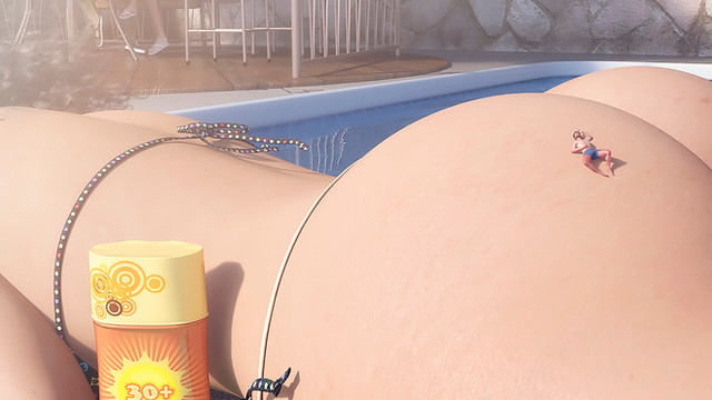 I just canβt stop staring at this image. Β Part of the reason, of course, it her stunning curves. Β But thereβs something about the perspective β almost from her point of view but not exactly, that makes it really engrossing. Β It feels as though Iβm a tiny pesrson as well, standing on her shoulder, watchitng this whole game unfold. Β Itβs voyeuristic in a way that most giantess images are not.