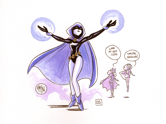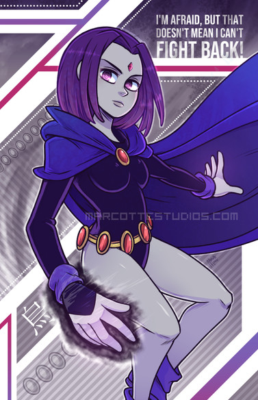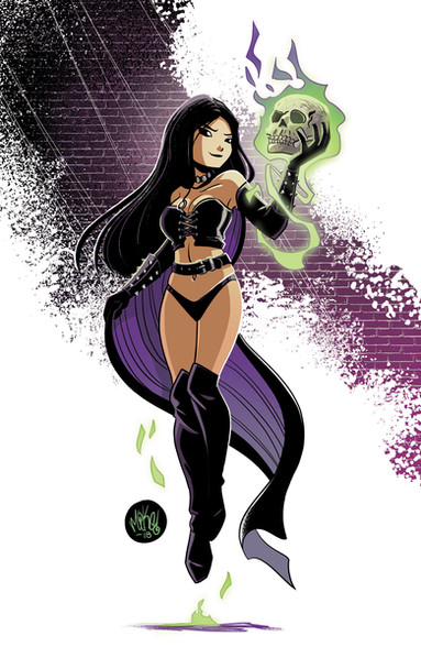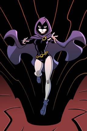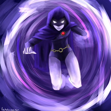 I love Raven' hair long, deep and dark, flowing in the wind! I wonder what that she holds onto is? Some kind of power she has that she has brought out through her arms and hands? Raven is an enigma to me. Is there more evil in her than good, and can she really use Black Magic for good? I THINK she's trying to be good, and believes she can best do that by being a superheroine fighting on the side of justice against that of crime, or evil. BUT, what if, on the other hand, she is only trying to CONVINCE herself, and others that she is good by fighting crime--that should prove it! But what if Black Magic is simply not made to be used for good? It's dark for a reason, or two, at least. It's probably evil, so the Black metaphor is used as a figure for the darkness--of Hell, of course, but also for a magic so wicked, and / or so powerful it must be hidden in indiscenable darkness, the scroll on which it is written available only to those who know where to look--Hell? And Raven, though she hates to admit it, is the Crown Princess of Hell, the only child I know of Trigon, Prince of Darkness: she knows precisely where to look, when she needs to--to find covert information--ancient, deep, dark secrets--like her own gleaming black locks, written long, long ago, inspired by the Master of Black Magic, Emperor of the Infernal Regions: Trigon, older than time, maybe like Lucifer, once the Brightest and most beloved of God, but jealous of Him gathered to his evil side 1 /3rd of the Heavenly Host and rebelled against God; was defeated and thrown out of Hell by the King Himself, and thence to Hell. So Trigon is older than time, and the mists of time likewise lay over these magical secrets making them all the more Dark, sequestered, hidden; but Raven knows already or has the knowledge, the Dark Gnosis, of this magic, or certainly knows where to go to find it. Does she use it for good? If she uses it for any reason, CAN she in fact be using it for a price? Is it not so that the Devil will demand his due, sooner or later? So that Raven's reckless use of Black Magic for good may result someday into her conscription==if even that word is applicable: it maybe willing accession--as Queen of Hel, pr Co-Regnant with her father. This isn't just speculation. When you use the devil's stuff for any reason you HAVE to pay him--isn't that the tradition? . . . . Beyond all doubt Raven, my favorite among DC characters along with Poison Ivy, is TORN between good and evil, but she's going to have to face some kind of consequence--except magic she was possibly taught sometime: she'll either have to come to final, favorable terms with her father so she can retain, in fact increase her power, or she's going to irrevokably reject him, losing her own inherited power, her Black Magic-knowledge, except magic she was possibly taught by her mom, even, maybe immortality. But, she'll be good, like her fellow Titans and other Super-heroes--just not so super anymore, small chance for immortality included. . . . Just what Raven is going to do with this apparent "Power-Ball" I don't know. The color of its rays is a little darkish, the same--identical to the darkish inside lining of Raven's lowing cloak. BUT Neither the rays nor the inside of Raven's cloak is black; they're dark reddish in color, and red is traditionally the color of Hell, fire, the Devil, etc.; but at the center of this ball of power a t the zenith, in the nave of the ball, a bright Light shines: God, goodness, the sun, revealing all secrets, the opposite of darkness and Hell (any 'flames' in Hell are used only for punitive purposes; they provide no light): so this is what I think of the Real Raven, and she's brilliantly depicted here: you who are Teen Titan followers remember the episode in which Raven is somehow entranced into thinking she must fulfill "the Prophecy," that she must serve her father. But she goes deep and dark into unconscious, and Raven is a little girl, frightened, alone, dressed in white: so as it happens the Power imminnating from her is her own, the white, bright light at the center is the real Raven, a sweet, innocent, good little girl robed in bright white surrounded by an unconscious, darkling yes, but the home of the Powerful Bright Light that brings out the real Raven, willing to "March into Hell for a Heavenly cause," emerging bright as an angel. . . . . Well, that's it. Brilliant idea, brilliant work--congratulations to you both! You have poetic as well as artistic (visually) artistic imagination.