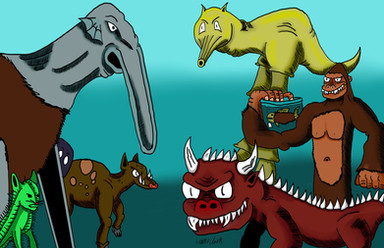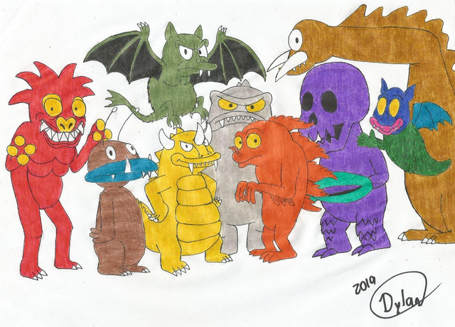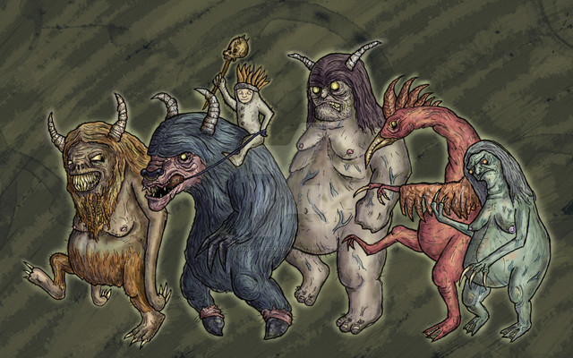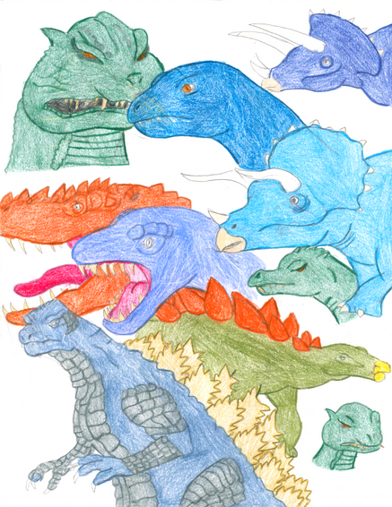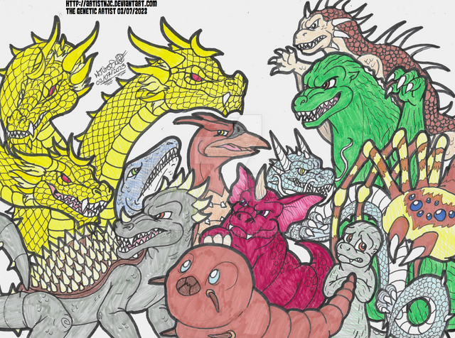 Godzilla and friends, Maurice Sendak style. I will likely shop around to see if anyone will accept this as a t-shirt design, but here's the full quality picture. Can you guess them all (for anyone who's a Godzilla fan, they're pretty easy).Also, I realized at last minute, once I'd finished the line art, that King Seesar would have been ridiculously perfect for this. So to anyone thinking the same thing, I'm sorry. Gigan also seemed like a good fit because of his multi-textured body, but his visor eye made him stand out too much from the others.
