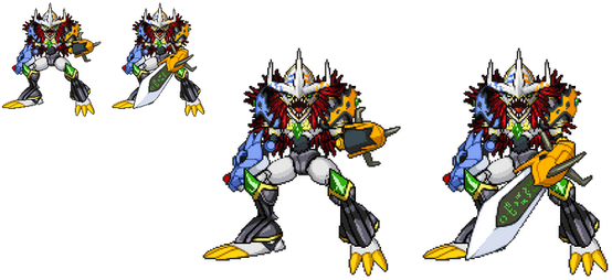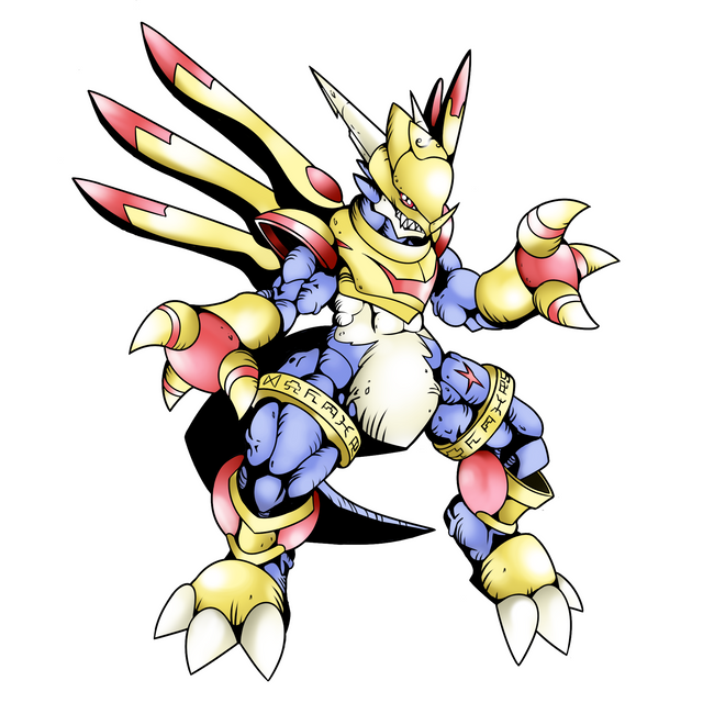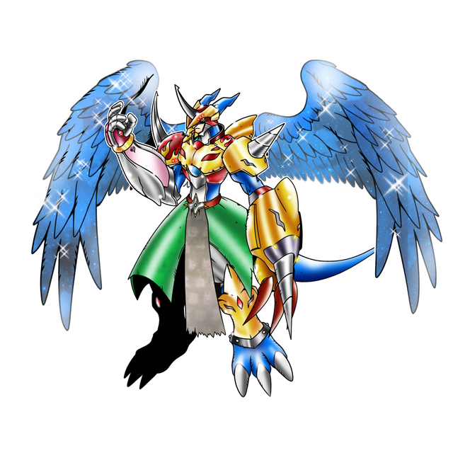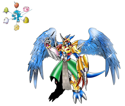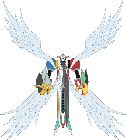 Evolves From: WarGreymon + MetalGarurumon + MegaKabuterimon + Zudumon + Garudamon + Lilymon + Angewomon + MagnaAngemon