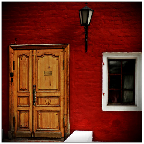 The colors are wonderful, but I wish it weren't cropped so tightly... There should be more to be seen of the red doors, enough that we can see more of the orange brick on the other side. Or enough of something else to complete the frame of the doors. That's my opinion anyway.