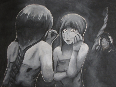 I have to agree. The hands...so delicately posed. And the half-and-half face with one side of the mouth tilted up, ah! Overall, this piece is striking and visually pleasing