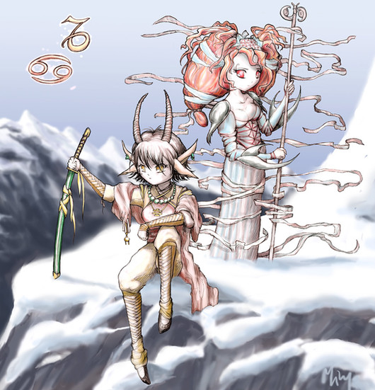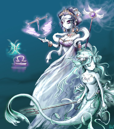 I'm actually quit fond of this one ^ ^ especially because it has an aquarious in it which is my zodiac. Impressive work on the more "light" atmosphere you created by using light colours and a soft background. The water in the middle is simply amazing. The characters are worked out very well~
