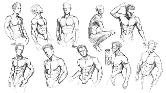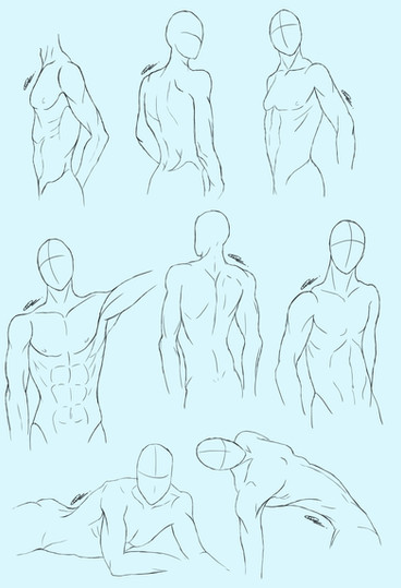 3. Keep in mind, that in contrast to women, men have a lower centre of gravity, so it is typical for their legs to be shorter. Male shoulders are generally wider than hips, so naturally they hold a wider rib cage. In this step, I have put in a basic idea of where this man's muscles belong.