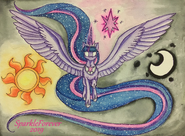 A while back, by Art teacher told me to take any song and paint it onto a record disk. Not the music video. Not the Cover Album. But what I see when I hear it.I chose the song Angelicus by Delerium, which is an electro New Age Band that I became very fond with in the past year. The song always made me think of a night sky with some kind of water feature. It also made me want to think of princess Luna from MLP:FIM, but I decided not to include that into this, do to the theme of abstract imagery that I was using instead.