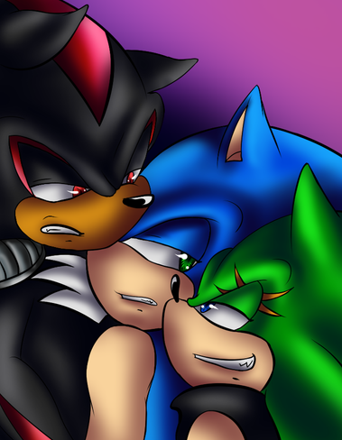 For her request, I drew a scene from her group RP. ^^ In the scene, Scourge fell ill and Sonic tries to help him walk. Shadow glares back at Scourge while Scourge just grins back at him. I... kind of forgot why Shadow's glaring at him