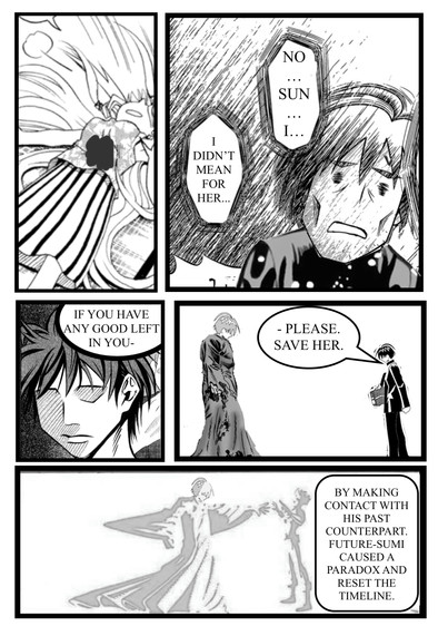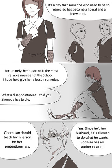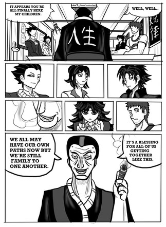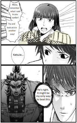 Here's today's fanfic-depic I made from chapter 3 part 2 of SilfofinaDragon's Sengoku Basara fanfic Finally Home (link here www.deviantart.com/slifofinadr… ). In this one, as Toyotomi Hideyoshi's daughter Kagehime "Kira" breaks the ice to some of her late father's subordinates of her relation, Ishida Mitsunari doesn't believe her, as Toyotomi and Takenaka Hanbei would have mentioned her. Kira says that he (Toyotomi) didn't need to, and after killing his wife/her mother Nene, she was sent to a temple for her safety in case Toyotomi had similar ideas what to do with her, and so she would be around to marry his successor. She then scowls and asks why they could forgive Date-Sanada Masa (Date Masamune and Sanada Yukimura's son) and his ex-split personality Sei (now in a body of his own from Kyogoku Maria's spellcraft) killed Toyotomi and Takenaka.I crafted this up Wednesday with materials from bl-doujinsouko.com/%e3%82%b5%e… , mangakakalot.com/chapter/ousam… , mangakakalot.com/chapter/ousam… , and www.77mh.com/201109/206250.htm… (page 3). None of witch (as Kira and Kyogoku are witches) I own.