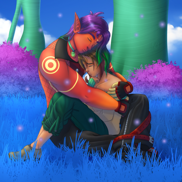Ce travail dessus, je ne sais même plus par où débuter les compliments o_o Non mais les poses ! Ils sont tellement à croquer tous les deux ! Et ce boulot sur l'anatomie, le line, le décor qui est juste sublime ! C'est doux, c'est tout sucre, tout bucolique et romantique, on en redemanderait encore et encore <3 Wow, rien à redire...