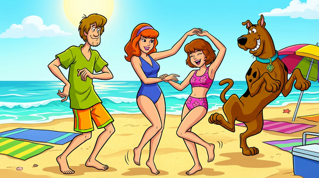 This looks like Shaggy and Scooby are saying: "CANNON-BALLLLL!!!", while the other are like "Stop, guys!" and Velma ends by saying "No, no, no, NO!". Pffff... I hope her book is waterproof (or something like that).