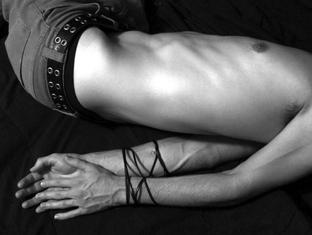my jaw dropped. this picture is perfect for so many reasons. the symmetry of his spine, the light falling on his skin, his body on the leather, the way he's sleeping, even, with his arm curled around his face, fingers open ... it's a very sensual picture, without trying to be. very unassuming.