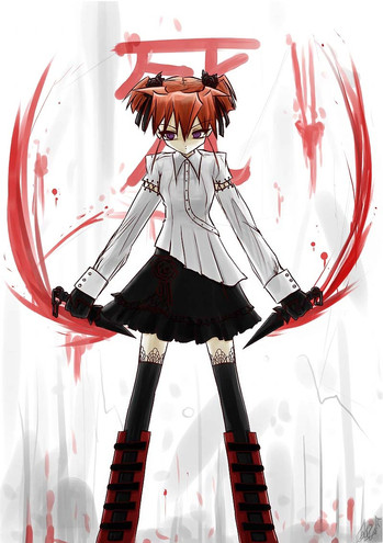 I drew this at the request of a friend who gave me instructions to draw "a chick with the usual assets". These 'assets' were not specified so naturally I construed the comment as meaning a huge fuck off weapon and blood.That's what you let yourself in for being ambiguous