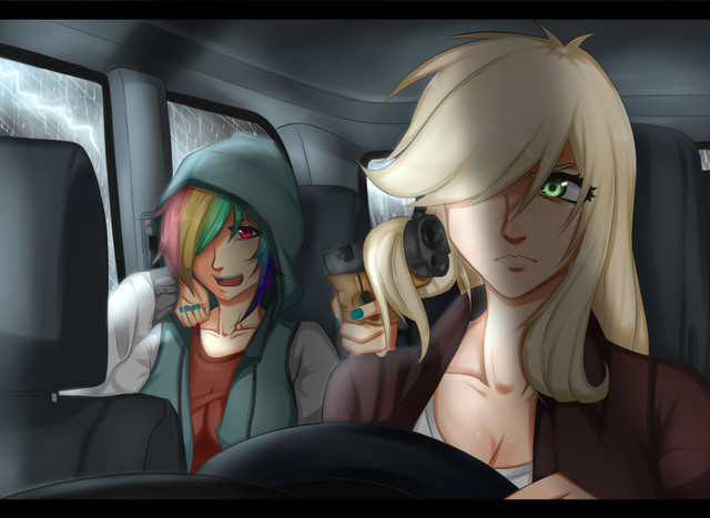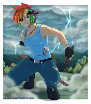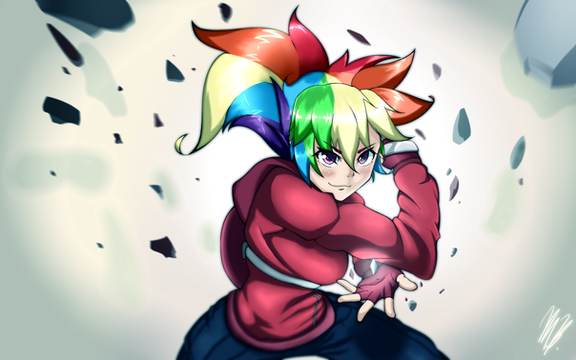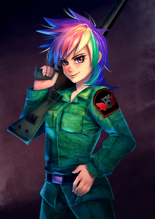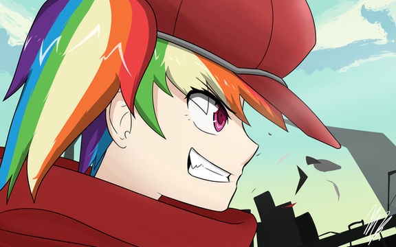 Rainbow Dash doesn't normally use weapons, so I wonder what might've caused her to pick up a pistol?There's only one character who has the ability to manifest any weapon and use it...