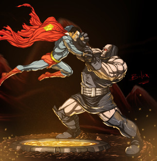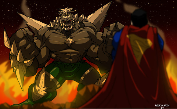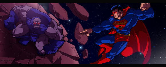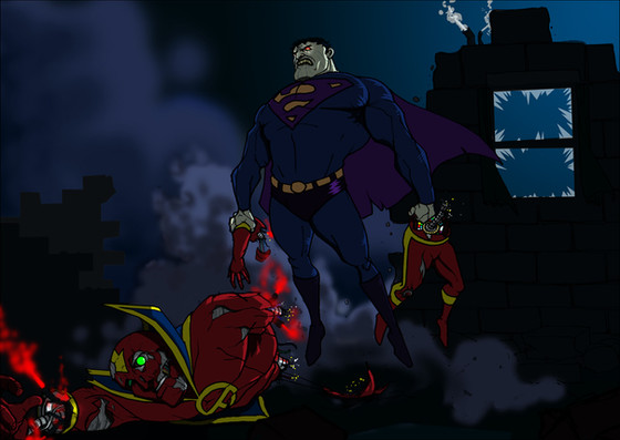 the stance of the (mettalic?) superman in the foreground is perfect. nice background too. beautiful colors. even the flames. also darkseid looks cool!