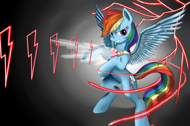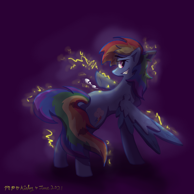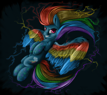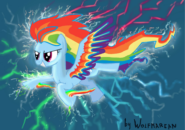 This is without a doubt the coolest image of Dangerous Dash made to date. The pose is dynamic and interesting, the expression is pure Rainbow Dash, the effects add to the image without overpowering it, and the pronghorn Dreaming marks fit her beautifully.