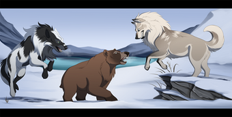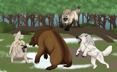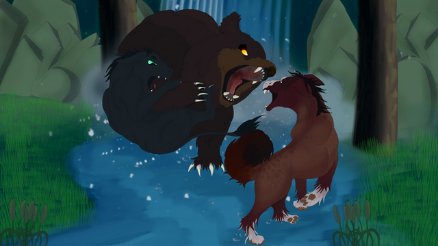 He lunged forward, going for the brown bear who continued to go close, swiping at Koda and roaring at him. His fangs dug into the thick flesh of the bear, causing the animal to cry out. Koda thrashed his head from side to side, increasing the damage dealt to the bear. But the light cream brown bear went for Berkly while Koda was preoccupied. Noticing at the last second, Koda let go of the brown bear and slammed himself into the cream one. This allowed the brown bear to bite into Koda’s hip, but no yelp came, just a louder snarl. He was done playing, he grabbed the cream bear now, slamming it to the ground, his hind leg kicking the darker of the bears in the face, keeping them as far from Berkly as possible. His teeth tore a chunk of flesh from the cream bear and then went for the brown one, biting down on its paw and crushing all the bones in it. It was obvious to these two bears they weren’t going to make it out alive if they continued, so as Koda stood panting, his teeth showing as blood dripped from his mouth, they turned tail and ran.