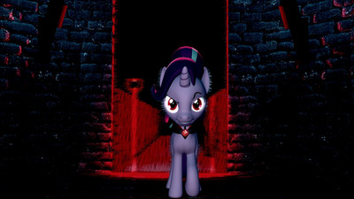 Twilight opens her eyes and grins wickedly. Her irises are a luminescent, eerie green. Her teeth bare a set of long, plaque-ridden fangs that overlap her bottom jaw. She speaks with a hiss.