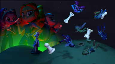 Chrysalis is silent, then screeches in rage as she launches herself at Twilight. Twilight, however, charges in return, summoning a barrier that knocks Queen Chrysalis back. Meanwhile, Starlight uses this as an opportunity to free the others. However, their cocoons open, and they land on their hooves. They stare at Starlight with glowing green eyes, their brows furrowed. Pinkie Pie grins maniacally.