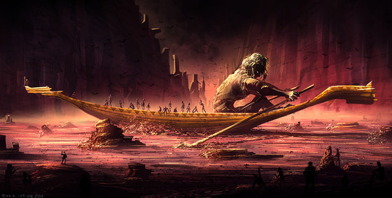 So many of the passengers look forward expectantly, trying to see something in the darkness. They scramble over each other's putrid flesh to garner an ounce of hope. Some give into the desperation and drink heavily from the rive Styx to forget their plight.