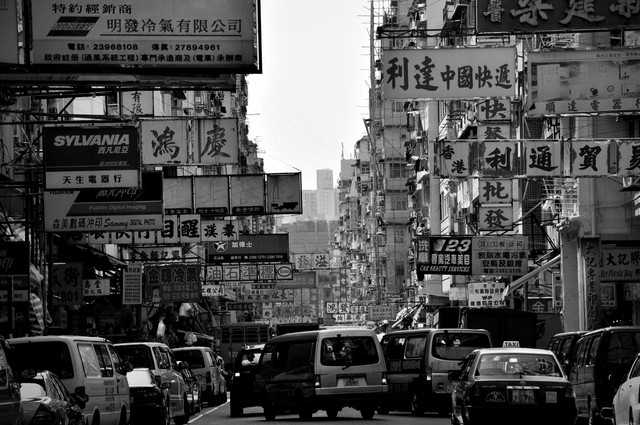- “Nathan Rd. Rush Hour,” at the corner of Nathan and Peking Rd. – Originally taken out of my apartment in Chungking Mansions, 7th floor. Tsimshatsui, Kowloon, Hong Kong, March 1997. Following the scooter you would directly enter Victoria Harbour.