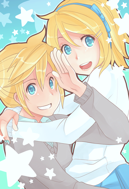 That description is funny. I love so much how you draw people (especially eyes, so sparkly! ) Rin looks pretty, Oliver looks cute and really happy, and Len looks cool.