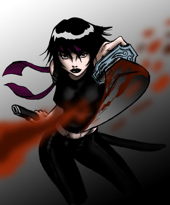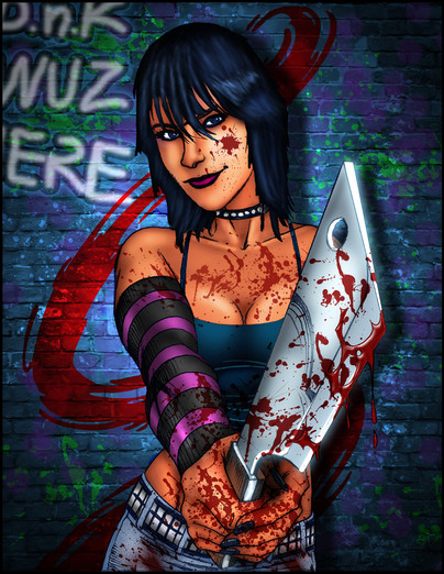 line art [link]well i colored it using photoshop, and I was not sure weather or not she should look like this for final peace or with less blood or just a stain in the background.