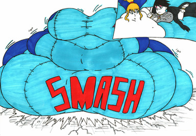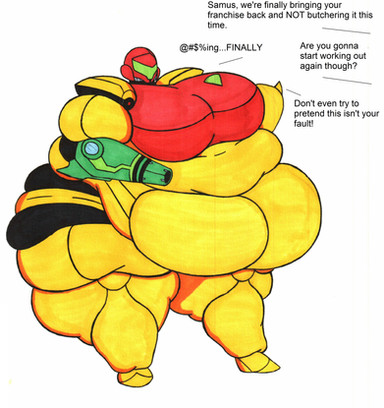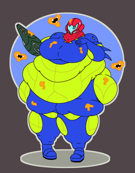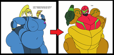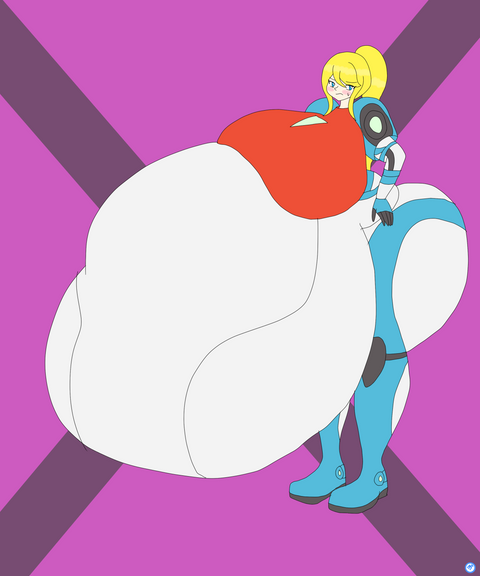 Good thing that the Zero Suit is a one-size-fits-all, you never know when one of your body part (or in this case the entire body) is going to spontaneously triple in size and weight after taking a bite of a juicy tomato (or any foodstuff really). Whether she's buff or obese, you can't ever get tired of Samus. Another great piece, keep on the good work.