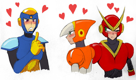 AAAAA. SO cute. Reminds me of a scene of a fan fic I'm writing. My character's stuck between Crash and Flash Man's CLONE (Plot twists.. meep.) and they both want her and she only loves one of them. Similar thing later with Crash and the Gemini twins and her. Romance and action Mega Man fan fics based of a roleplay X3