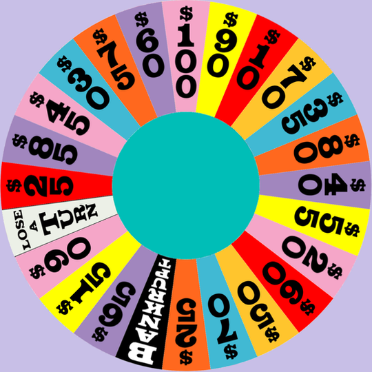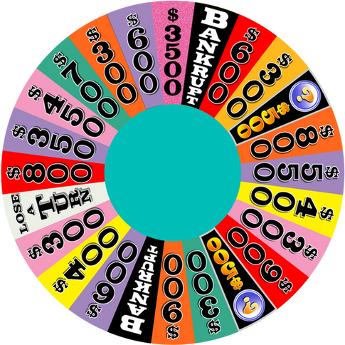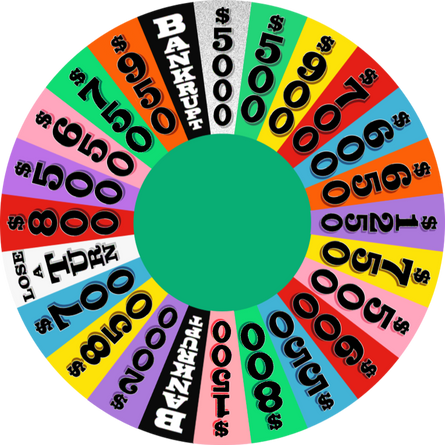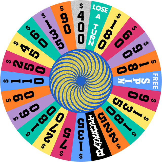 I have the honor of hosting a Wheel game with my friends. When I got that news, I got to making four sets of wheels for 6 rounds of play: 4 regular rounds, the Speed-Up Round and the Bonus Round.This wheel is used in Round 4 and beyond. The top dollar value is $5,000. The Free Spin token is removed if it hasn't been obtained within Rounds 1 through 3. Yellow $1,500 and $2,000 wedges, replacing both yellow $400 wedges, make their triumphant return!