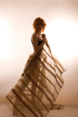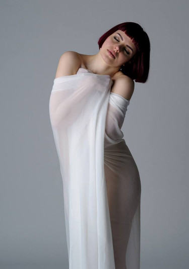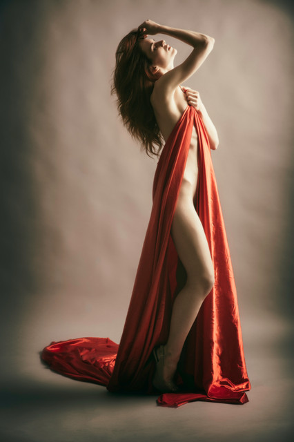 the fabric adds to the softness of the image with the warm colours and the soft light showing the smoothness of her skin and the gentle of her pose...
