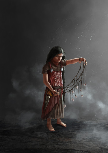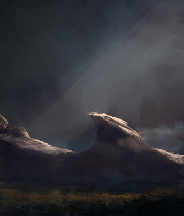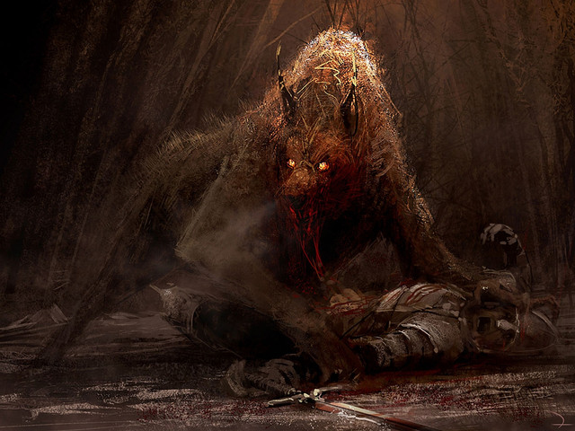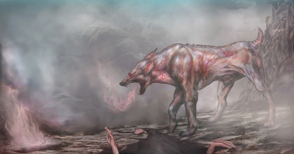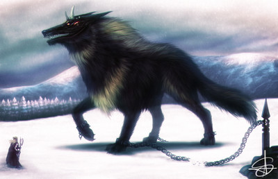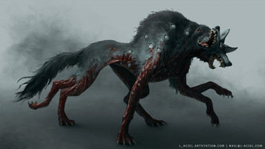 In Edda poetry Fenrir kills the goddess of sun, Sol. The starting point of the concept was consideration how this kind of monster could look like after eating the source of heat and light with its burned eyes and flesh. On his body are remnants of Gleipnir, in norse mythology light-weight chains used by gods to imprison him, here more like net. His jaws are pierced because of sword gods have used to block them.