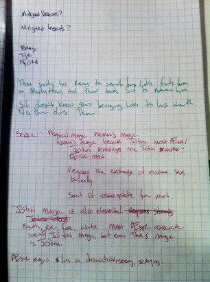 There are also pages like this that I almost wound up keeping. A lot of the basic ideas are there, but the story didn't wind up really going like this at all. But even though I'm not using them, the first round of notes wound up being immensely useful. They helped me get to know the world and flesh out character motivations, which helped the characters seem much more natural by the time I finally got to that stage.
