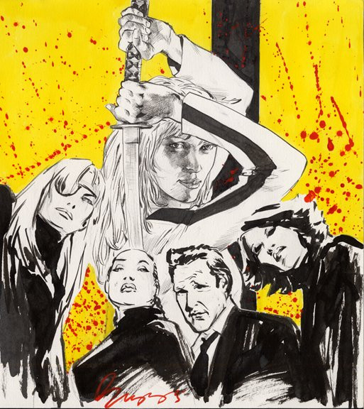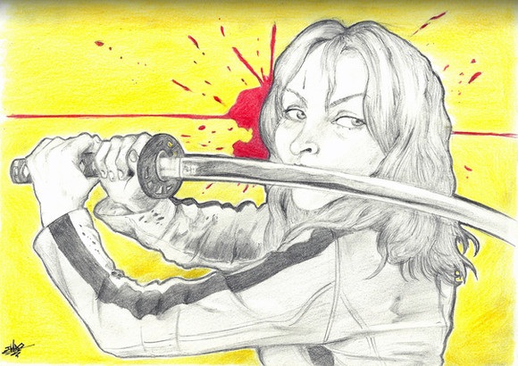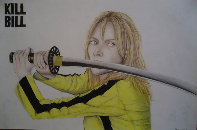 Drawing dedicated to the film Kill Bill vol1, one of the coolest films I've seen! One of my fav scenes in the film was the anime scene, I somehow wanted to use this in my drawing. I started with a drawing of Uma in the centre. I then filled up the background around her with some of my fav moments from the anime scene. At first I wanted to do it all in color but I thought Uma wouldn't stand out as much so I did the anime background in black and white. I did it the hard way, had my dvd on pause to draw and shade the entire anime background! Caused alittle bit of pain in my eyes afterwards but it was worth it.Pencil, color pencil and pen.