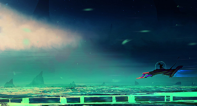 Are these completely hand-drawn? Because oh my goodness... The cliffs on the side have so much detail and the water and the spaceship gahhhh it's so good!!