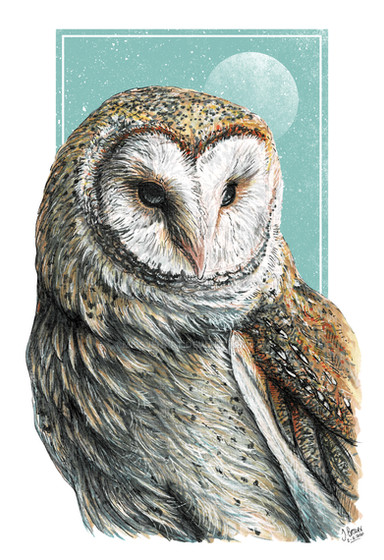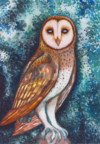 What's left to say about barn owls? They're beautiful and amazing. They fly so silently in the night, like ghosts.Done with ink and watercolor.