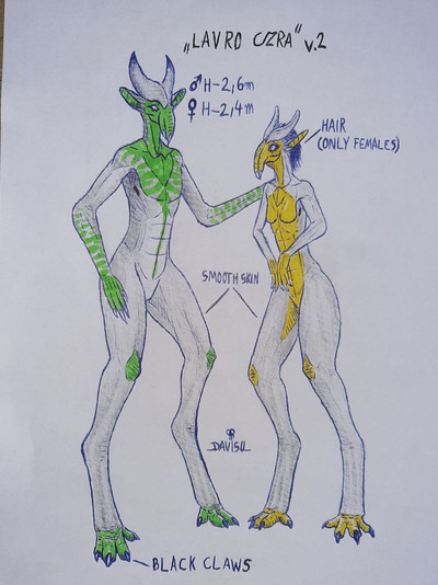 • Biology is a bit strange. Males and females are very similar, with the sprouts from their forehead determining the gender. Males only have one, as females have two. The sprouts are very personal and the whole area seems inappropriate for anyone but themselves and their lover to touch.