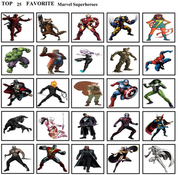 Row 6: Wolverine, Deadpool, Superman, Wonderwoman, Aquaman