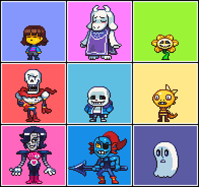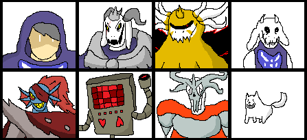 I am feeling nostalgic for Undertale right now so here is a drawing of most of the main characters from it.In order by row from top to bottom is Asgore, Sans, Papyrus, Toriel, Frisk, Flowey, Alphys, Undyne, and Mettaton.