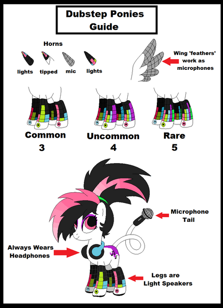 As you can probably tell by the guides at the top, the ponies legs consist of these speaker designs. However their uniqueness doesn't stop at their legs. Their ears, wings, and any horns they have are also made out of glass or plastic. Their horns generally have an LED inside of them that glow when they use magic, and the base of their tails are wires. Another peculiar feature of theirs is that their manes and tails always sparkle, and they also have a set of LED's in various shapes on their backs that semi act as Cutie Marks. Basically these guys are really fun at parties!