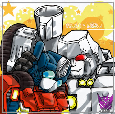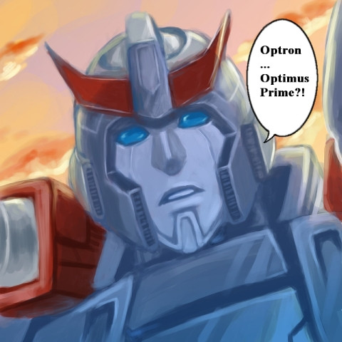This pic is for my friend Sfmk2's fanfic"Time Diver".In this story,Scorponok devised a time machine,sent Optimus Prime and Megatron into past and made them archivist Optronix and miner Megatron again...and then they must ally to defeat Scorponok.This scene happened when miner Megatron(with the soul of lord Megatron inside his body) fled away from Energon mine and found archivist Optronix(with the soul of Autobots leader Optimus Prime inside his body).