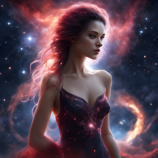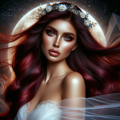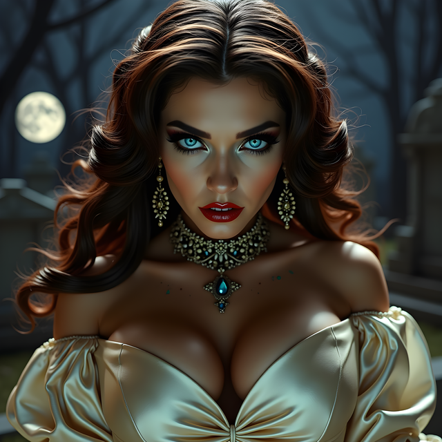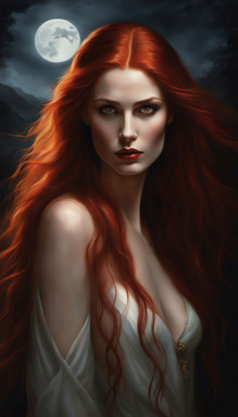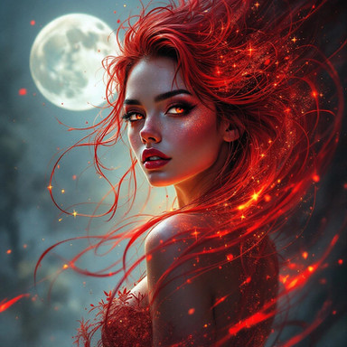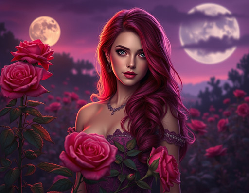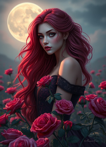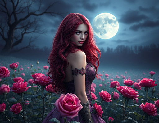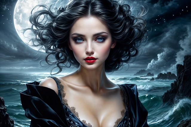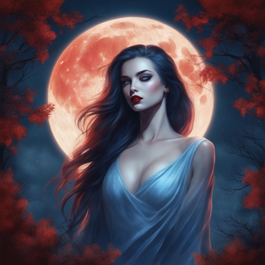 In the enchanting woods under the shimmering moonlight, a captivating woman with flowing long hair and luscious red lips stands gracefully amidst the towering trees and dancing shadows. Her ethereal beauty is accentuated by the mystical aura of the forest, creating a mesmerizing scene that evokes a sense of mystery and allure.