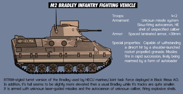 The Hale Fighting Vehicle - 5A1 'Boxer' was developed as a highly mobile, lightweight armoured transport vehicle for the Escean military. Adopted in 2101, the vehicle is built upon a heavily modified Hale/Light series hull, being raised in height to accommodate a troop compartment capable of transporting one full squad of seven fully equipped troops. A crew of two operates the vehicle, with the vehicle commander also controlling the 25mm autocannon from a position in the rear compartment. This heavily protected vehicle makes extensive use of modular, spaced armour blocks mounted around its hull, as well as numerous smoke dischargers for concealment in the visual and infrared ranges. The rear door lowers to form a ramp, while roof hatches can be accessed by passengers for emergency egress, or the engaging of targets with the stowed anti-tank or anti-aircraft missiles commonly carried by the vehicle.