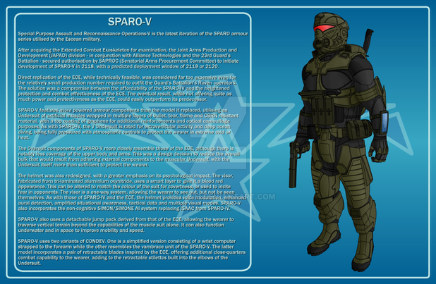 The CEVA design is civilian only, but you could militarise it by attaching ammo pouches/sheaths/holsters to its equipment points or don a military exosuit like an EX-02 (as Sato does in the plot).