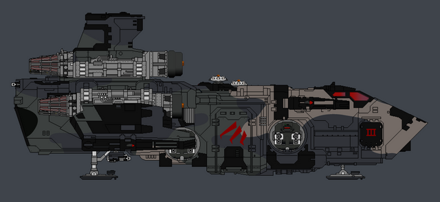 Armament: 6x 30mm K-9 Dual-Gun Gatling Turrets (1x Chin, 2x Flanks, 1x Dorsal, 2x Tail), 2x K-450 200mm Kinetic, Accelerated Projectile Cannon, 2x 11mm K-1B Gatling Cannon.